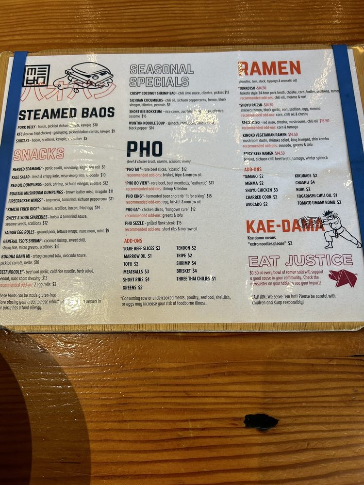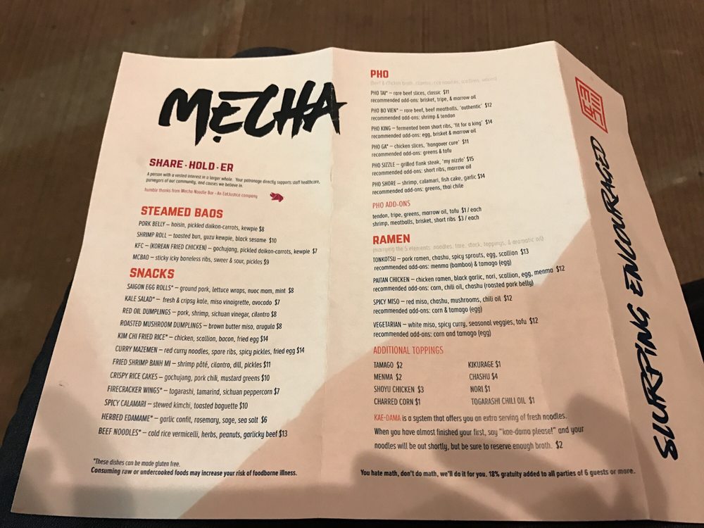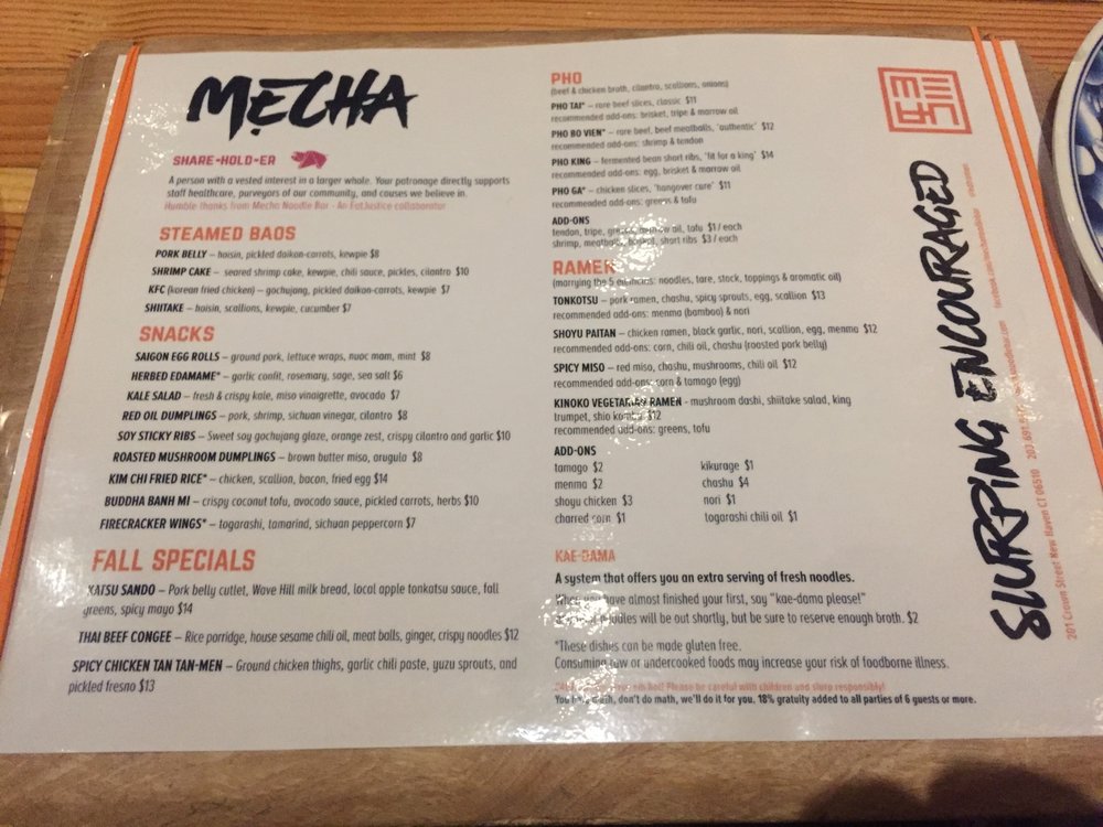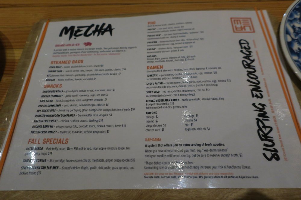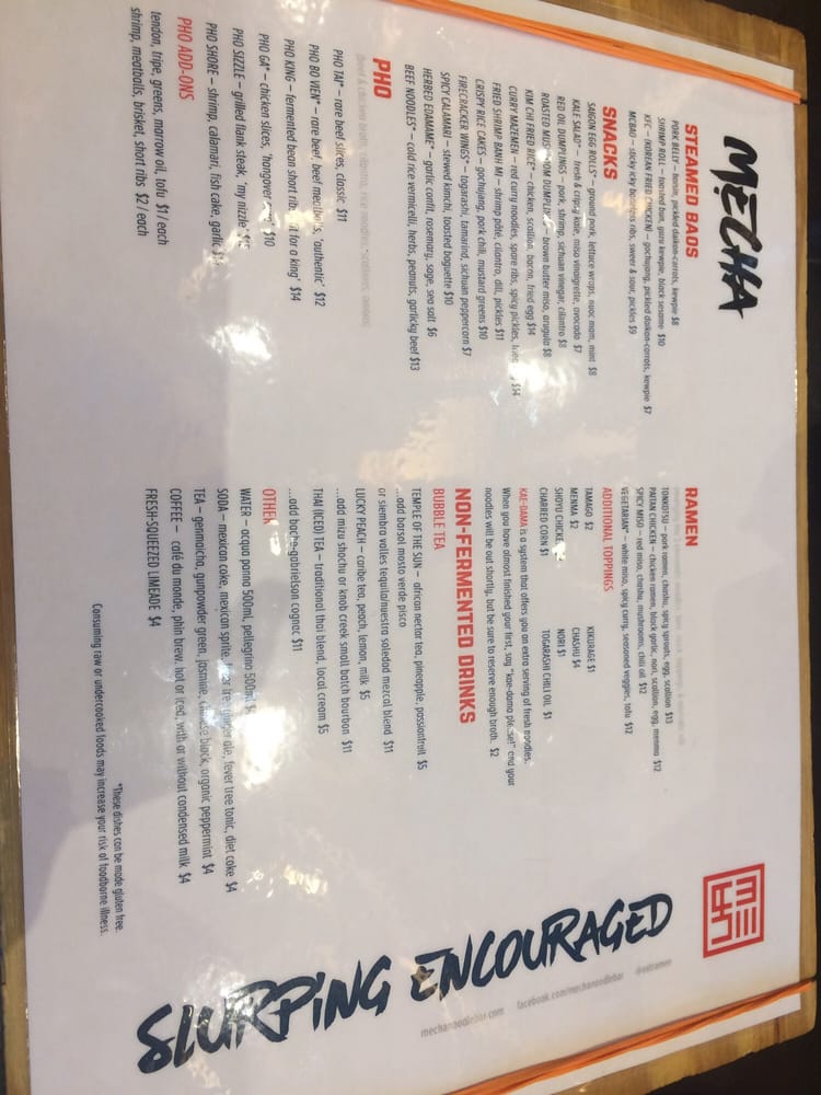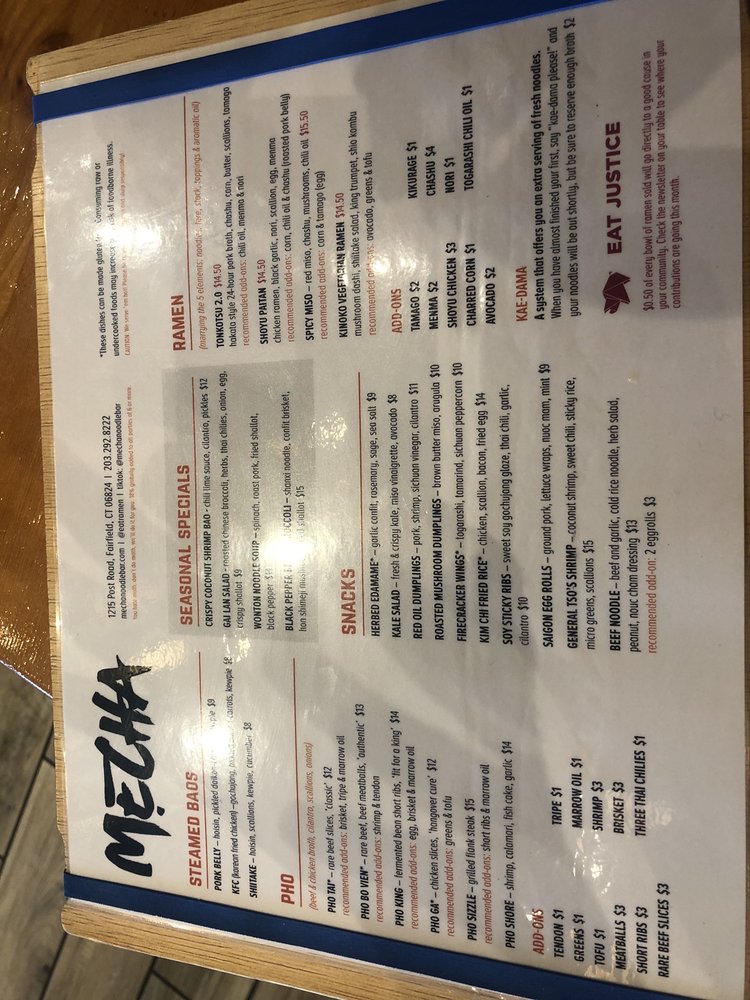 Introducing the menu at Mecha Noodle Bar, located in Fairfield, CT, offers a wide range of Asian-inspired dishes with unique flavors and options for everyone. From Lemongrass Spare Ribs to Beef Noodles, the snacks section provides a variety of starters to tantalize your taste buds. The Pho selections like Pho King and Pho Sizzle are a must-try, while the Ramen options like Vegetarian and Tonkotsu are perfect for noodle lovers. Customers rave about the delicious food and excellent service, with standout dishes like the pork bao buns and spicy beef noodles earning high praise. The casual and trendy atmosphere, complete with gender-neutral restrooms and free Wi-Fi, makes Mecha Noodle Bar a great spot for dining with friends and family. Don't miss the opportunity to experience the flavorful dishes and welcoming ambiance at Mecha Noodle Bar.